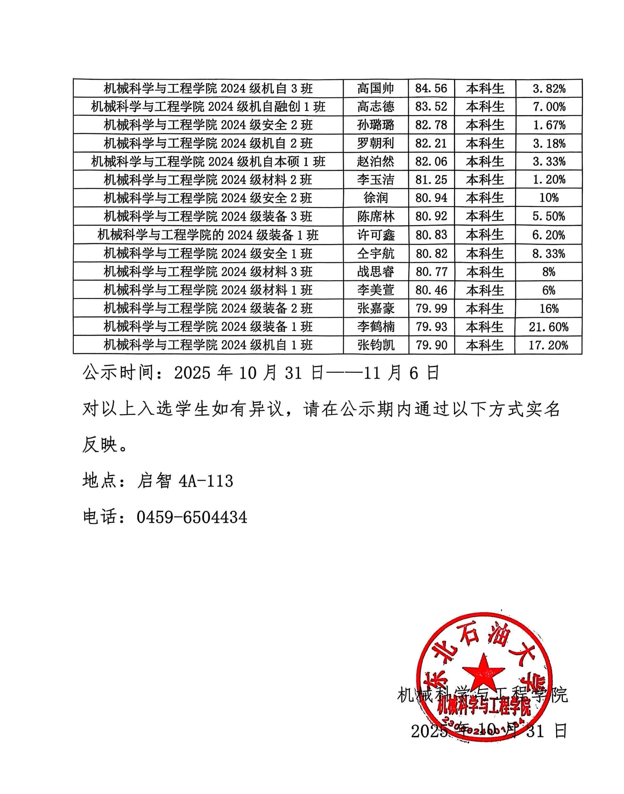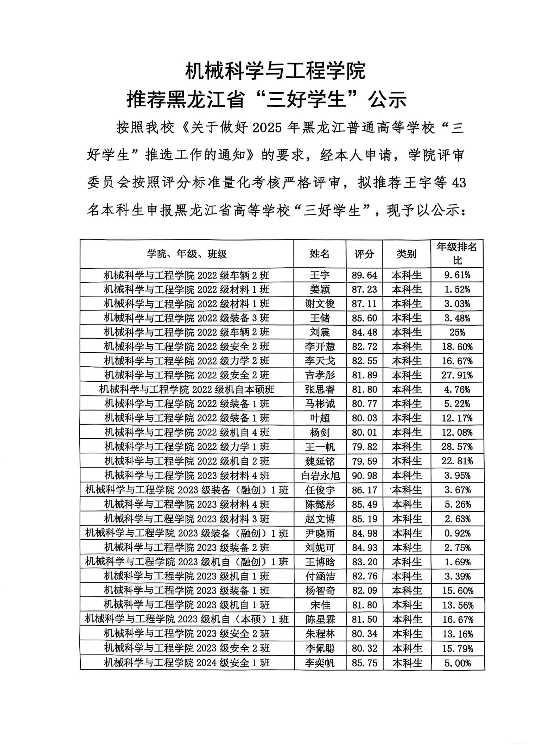 机械科学与工程学院推荐黑龙江省“三好学生”公示